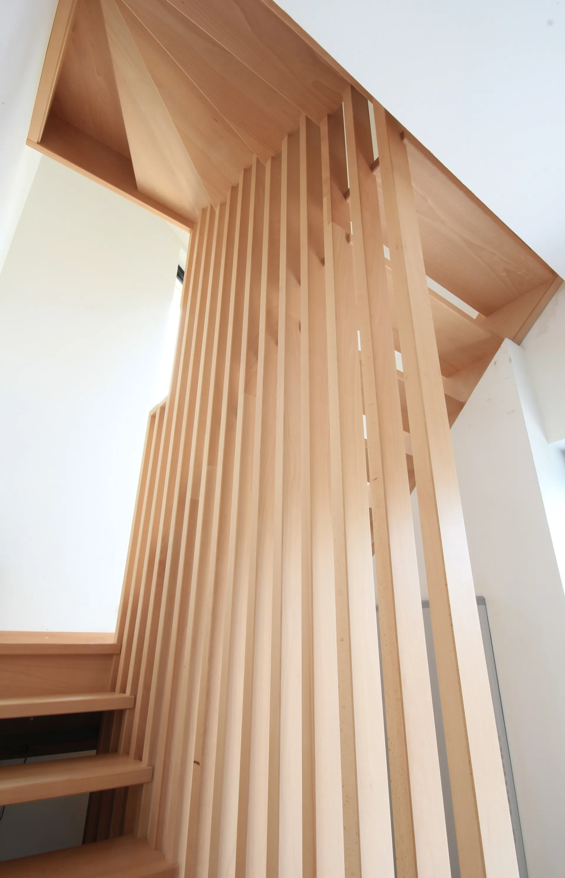 Le claustra est généralement composé de montants verticaux de 100*40 mm. L’espace entre les montants est de +/- 8 cm. Le claustra remplace la rampe intérieure tout en amenant de l’intimité et de la lumière.